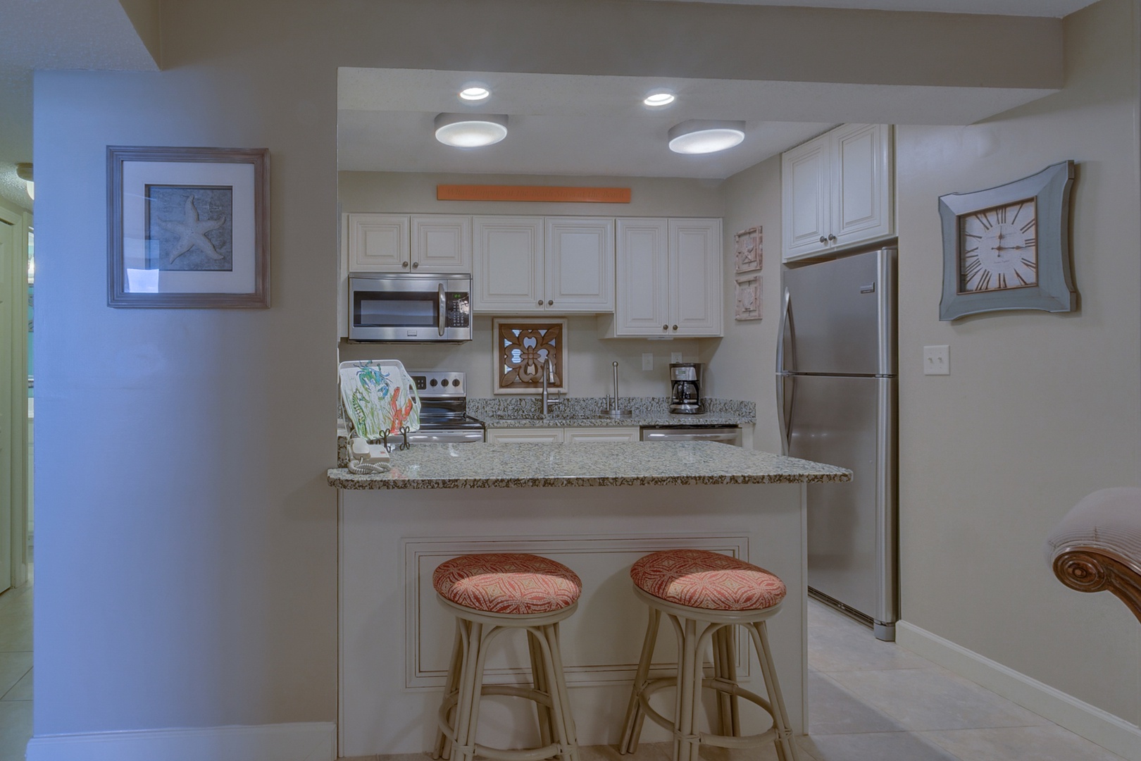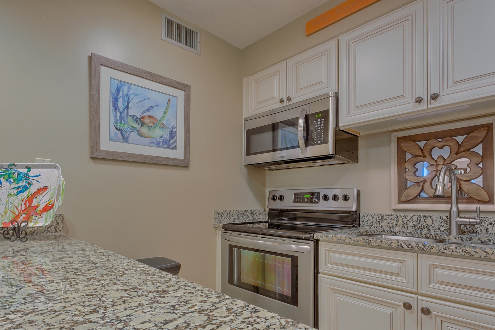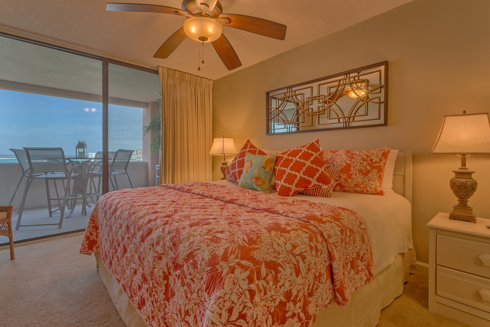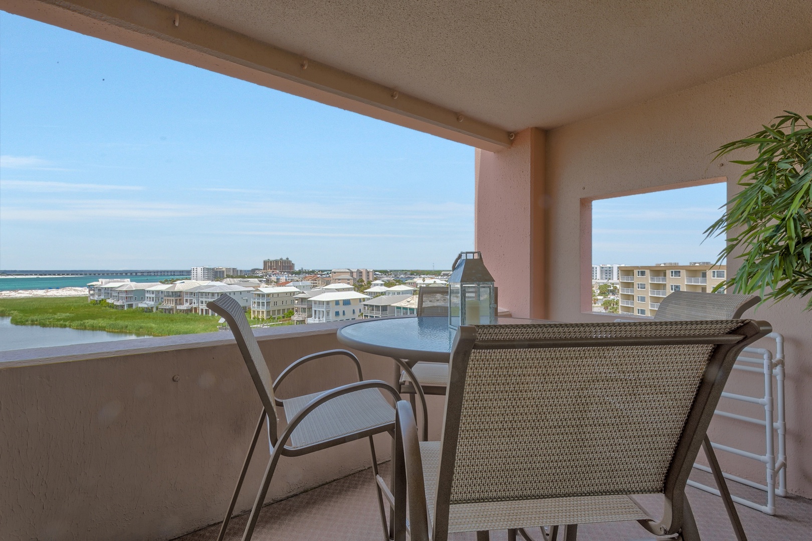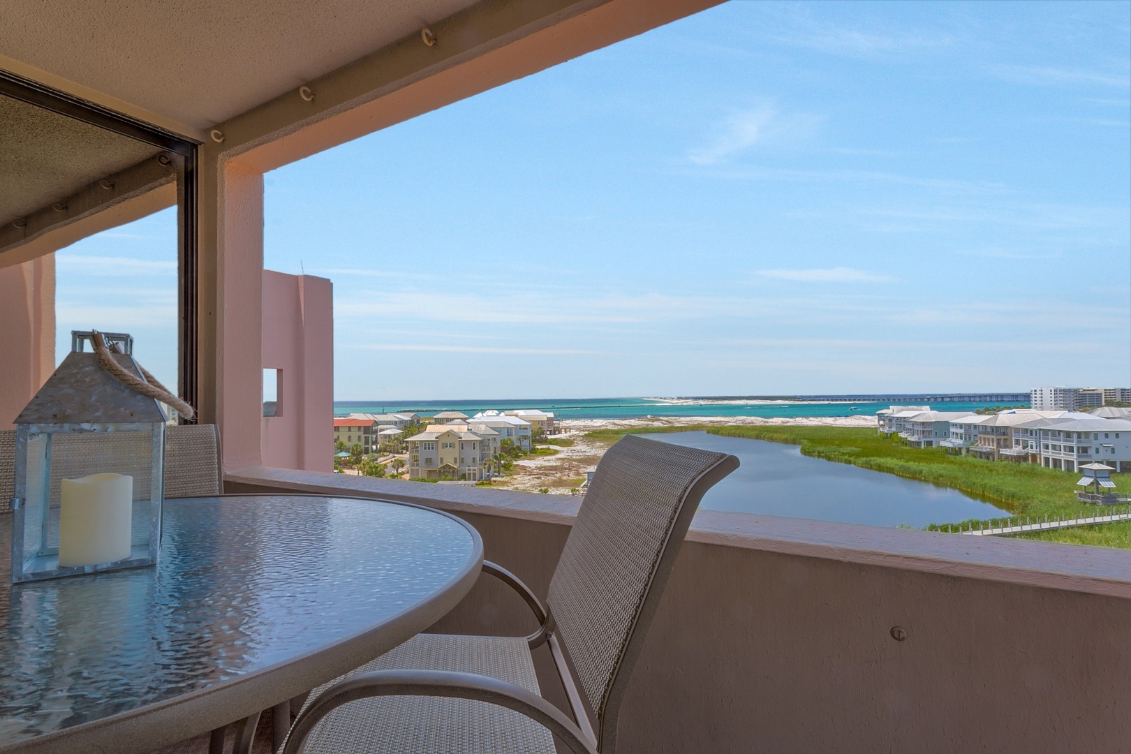 6th Floor - 2 Bedroom and 2 Bathroom Unit | This top floor unit was updated 2020 with new beach cottage style furniture in the family area, installation of new ceiling fans throughout, and new flooring in the bedrooms. Brand new wall-mounted larger “Smart TV’s” were installed in all viewing areas which provide access to the most popular streaming sites. Your accommodations include a master suite with a king-sized bed and ensuite bathroom with a tub/shower combination. The guest bedroom includes a queen-sized bed and a full-sized bed for the younger set; or for separation of guests, there is a new sleeper sofa in the living area. Take a relaxing shower in the hallway bathroom including a vanity storage cabinet. Prepare your favorite meals in the renovated kitchen, which is fully equipped with all necessary utensils, extra pantry shelving, stainless steel appliances, updated cabinetry, and granite countertops. From this unit, you will enjoy terrific views of the ocean, East Pass, Lake Christina, Destin Harbor, and Crab Island. Enjoy a morning cup of coffee on the open balcony while watching the boats sail along the East Pass or enjoy a romantic evening dinner while viewing the breathtaking sunsets. You will also have a front row seat for fireworks displays and occasional aerobatics by local WWII planes. For outdoor fun, you are just “steps” away from the beach and the many resort amenities which includes our Pavilion for family gatherings, nightly entertainment, and other planned activities. Also, you are very conveniently located to local shopping, great restaurants and other harbor activities all of which ensure the perfect stay in unit 618B at Jetty East.