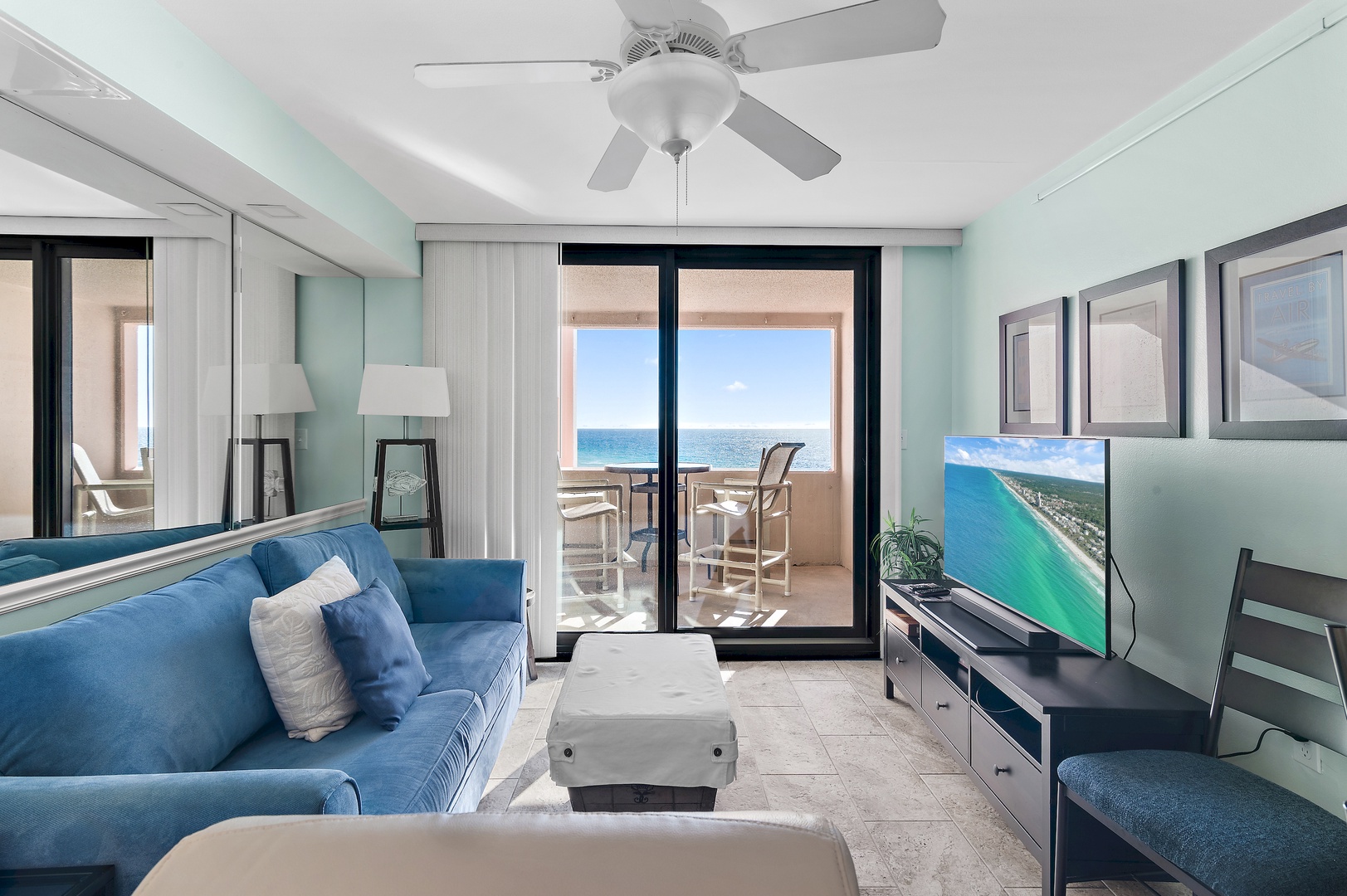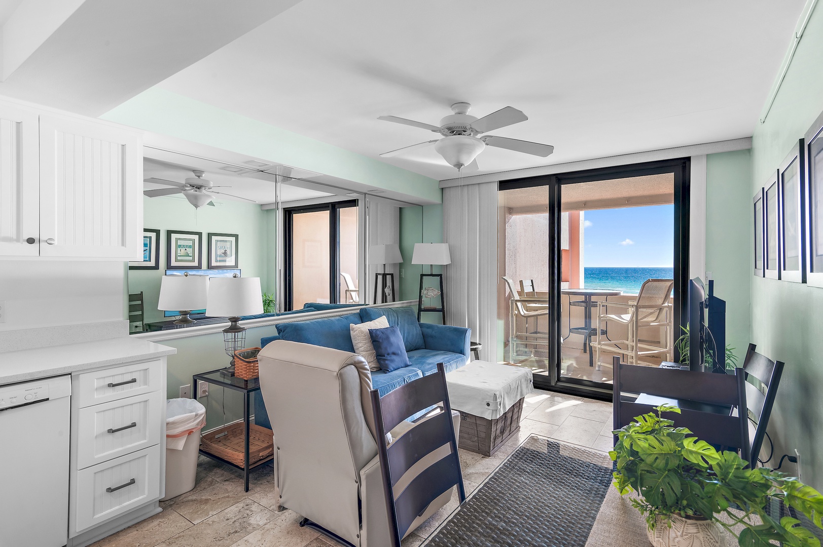 6th Floor, One Bedroom, One Bathroom Recently renovated in 2018, with a Gulf View, King Size Bed in Bedroom, Sofa Sleeper in Living Area. The Kitchen is open and the Mirrored Wall in the Living Area expands the space. The Glass Doors in the Living Area Go Out to the Open Balcony with Bar Height Furniture. Keep cool with the Ceiling Fans in Living Area and Bedroom. Watch the Large LCD TV and DVD Player in Living Area or the TV in Bedroom.