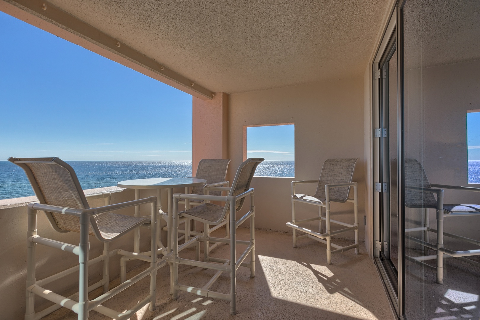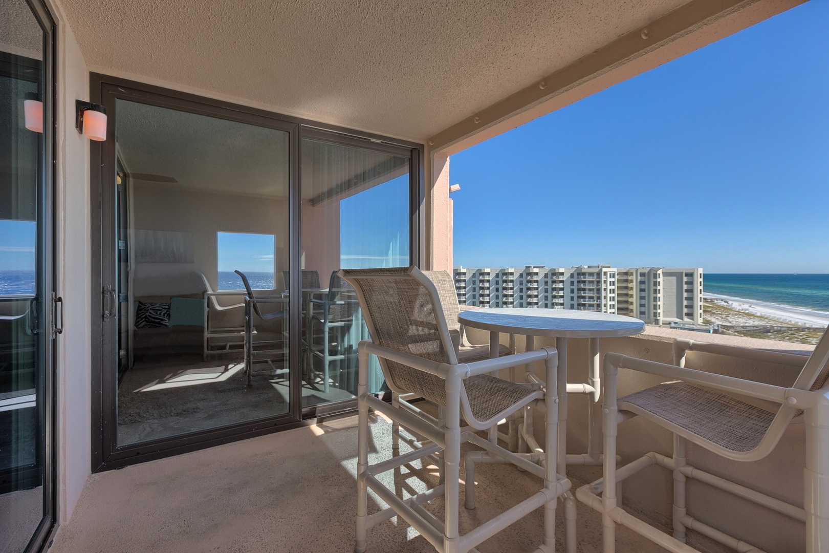 6th Floor, Two Bedroom, One Bath, King Size Bed in Master Bedroom, Two Full Size Beds in Secondary Bedroom, Sleeper Sofa in Living Area. Light, bright, recently renovated Gulf Front Modern Chic! Amazing view of the gulf, pool and pavilion. The master/living areas have new large glass doors that lead out to the open balcony where you can enjoy the bar height furniture and relax to the spectacular view.