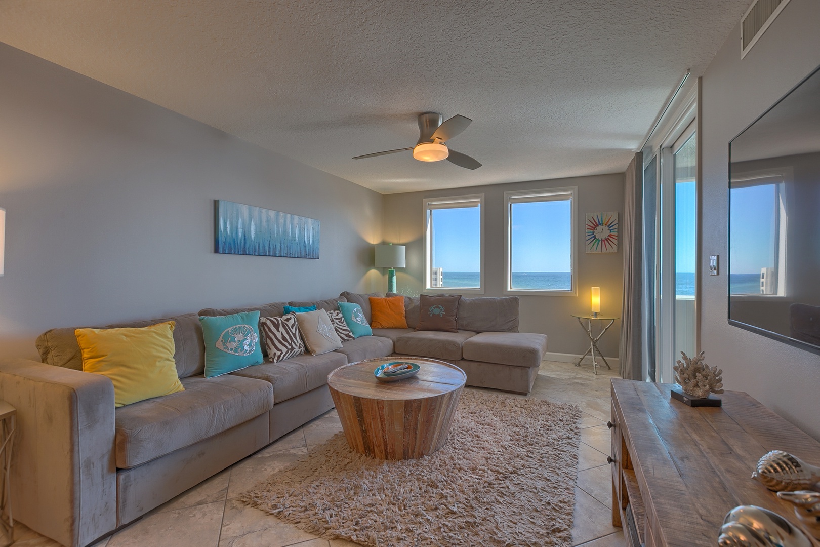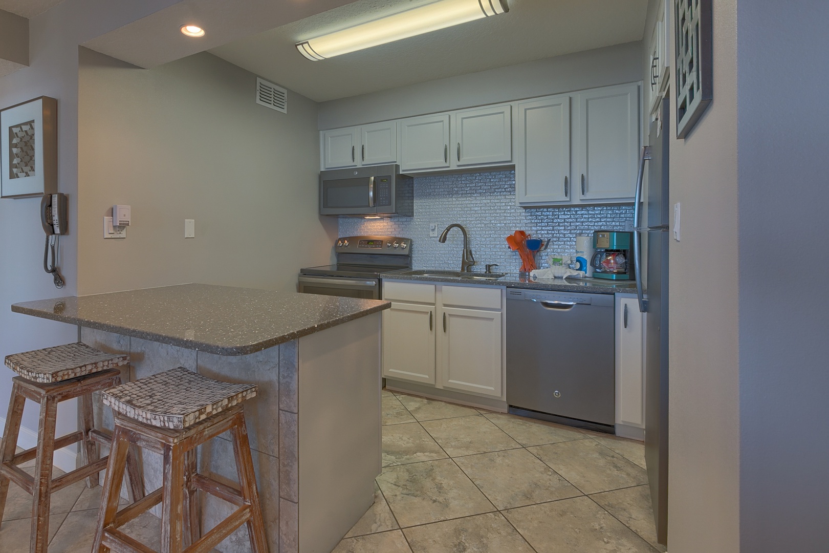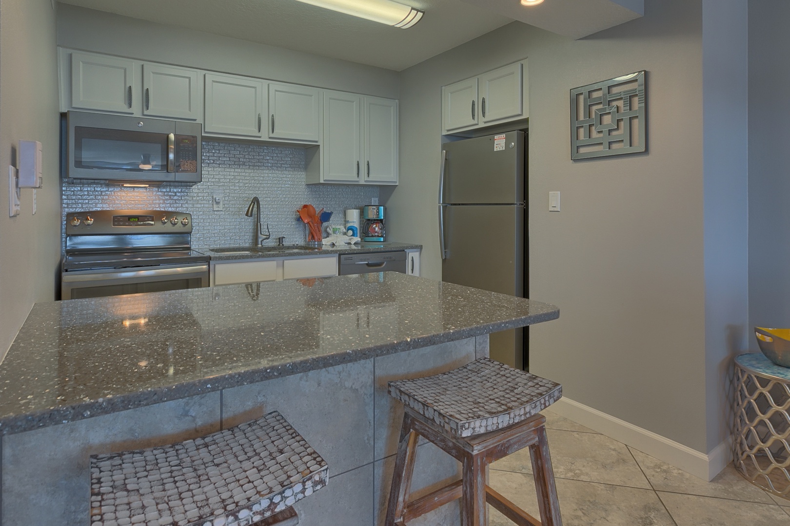 For your serenity all the rooms have adjustable speed lighted ceiling fans. Comfortably walk the beautiful diagonally laid porcelain tile which takes you throughout each room. You can enjoy all the latest technology with the 60 inch full motion swivel mount Smart LED HD tv/Blue-ray player in the living room, 55 inch Smart LED HD tv/Blue-ray in the Master and 40 inch Smart LED HD tv/Blue-ray in secondary bedroom. Enjoy the beauty of the upscale quartz countertops, custom backsplash, new GE metallic slate appliances along with new essential cookware. To complete your comfort relish the Xtra long plush chaise sofa which can easily sleep and additional person or two!