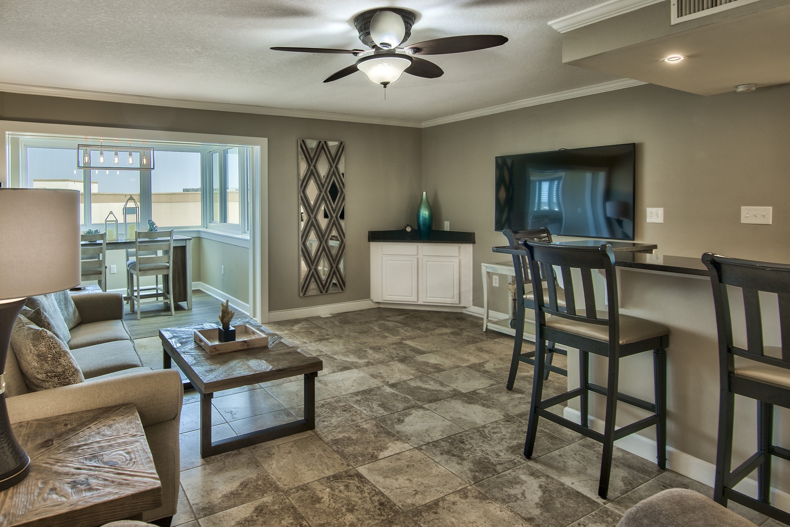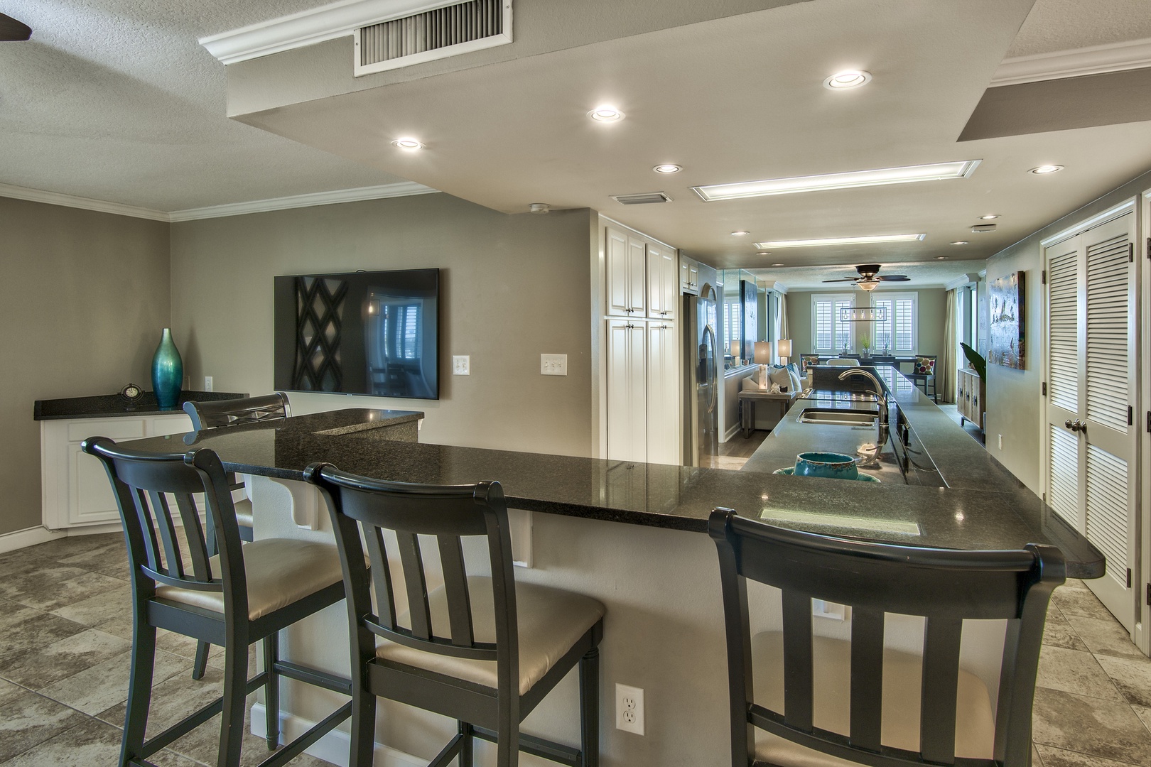 Fabulous end Gulf unit was new to the rental program April 2019. Remodeled to a 4 bedroom/ 3 bath unit February 2020…and sleeps 10. This condo is beach friendly with tile or faux wood plank flooring throughout, Three bedrooms boast King size beds, and large wall mounted flat screen TV's. The new 4th bedroom is small but comfortable, with a new queen size bed, and fun pendant lighting. The Den has a Queen Sleeper Sofa as well as the Living Room. This is the perfect unit for our guests that like to entertain. Furnished with original artwork ,there are two living spaces with large flat screen smart TV's. Counter height dining tables that are perfectly located to take in the Gulf front views… In addition, there is room for 4 at the kitchen breakfast bar. The open kitchen design allows for the chef in your party to create those incredible Gulf inspired meals while entertaining the rest of the crowd. Lighting options offer plenty of options to set the mood and ambiance for a memorable vacation.